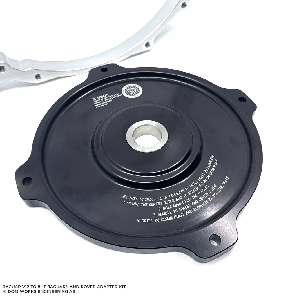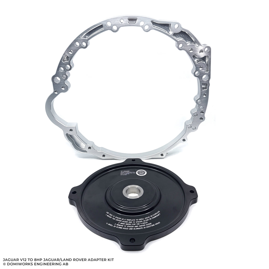 Adapter kit to fit a Jaguar/Land Rover 4-bolt converter transmission to a Jaguar V12 engine.
