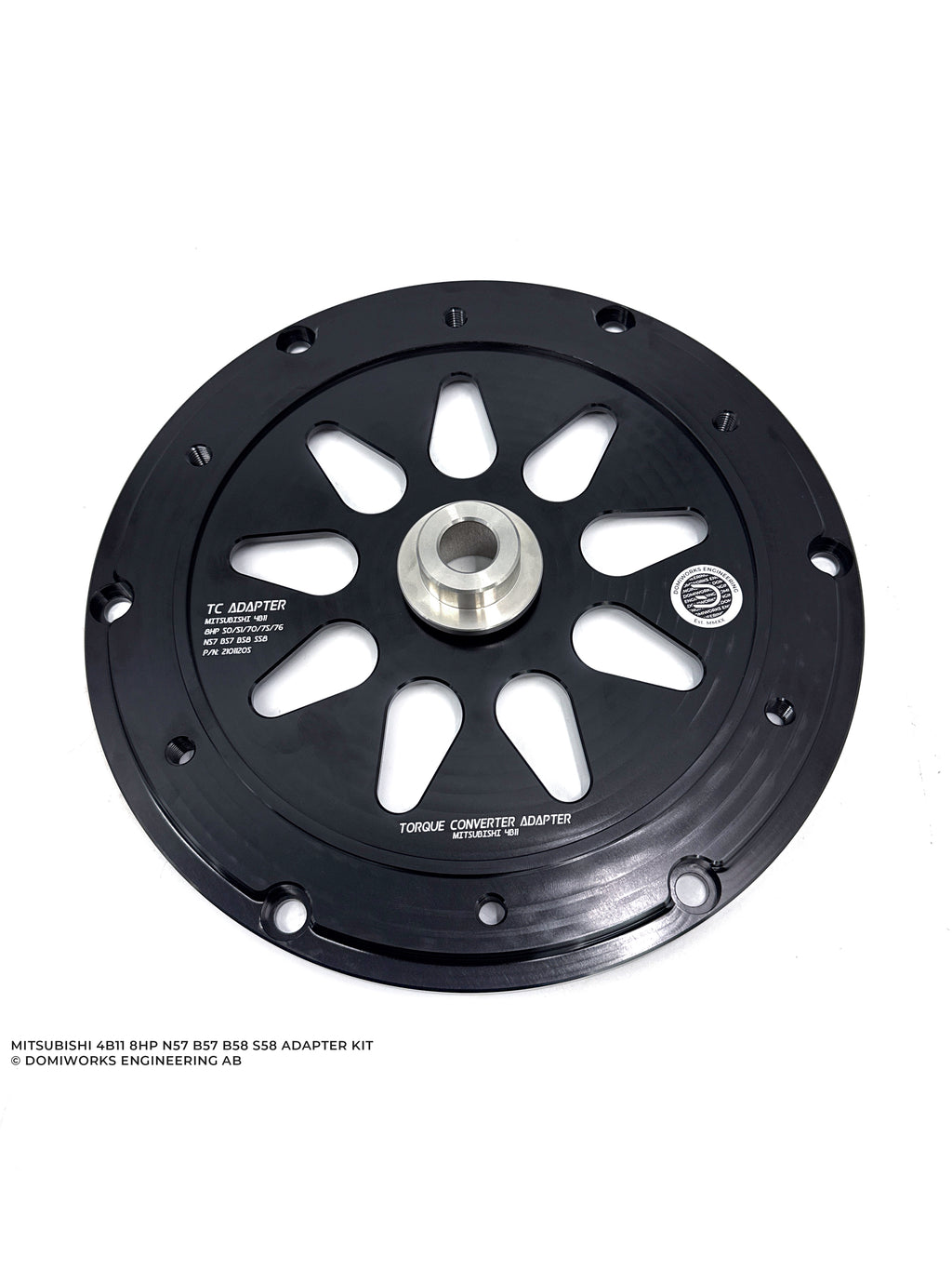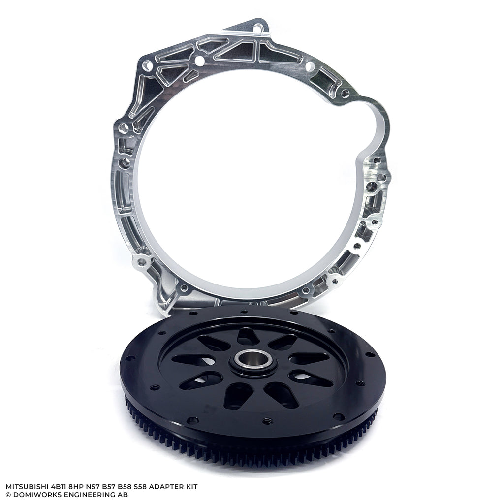 Adapter kit to fit a BMW 8HP 50/70/75/76 N47 N57 B58 B57 S58 gearbox to a Mitsubishi 4B11 with 7-bolt flywheel.